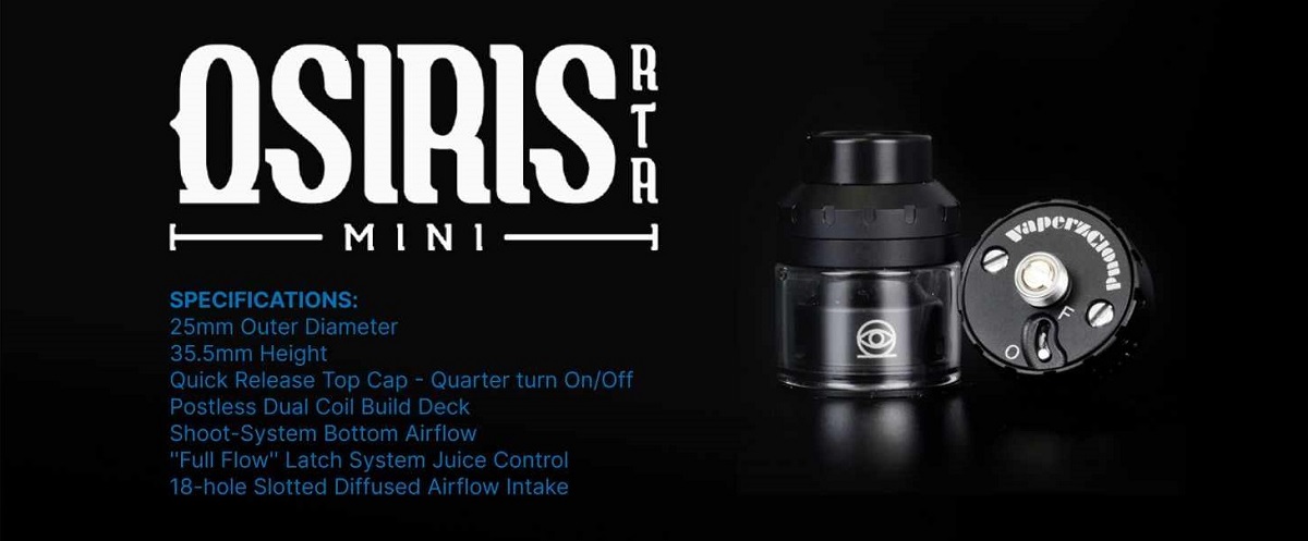 Το Osiris Mini RTA είναι ο πιο πρόσφατος 25mm RTA διπλής αντίστασης με postlessdeck που εντάσσεται στη σειρά υλικού VaperzCloud! Το deck φέρει τέσσερις μεμονωμένες οπές 2,5mm x 2,0mm για εύκολη εγκατάσταση σε αντίσταση με τέσσερις ατομικές θύρες όπου περνάει το βαμβάκι για άτμισμα υψηλής ισχύος!