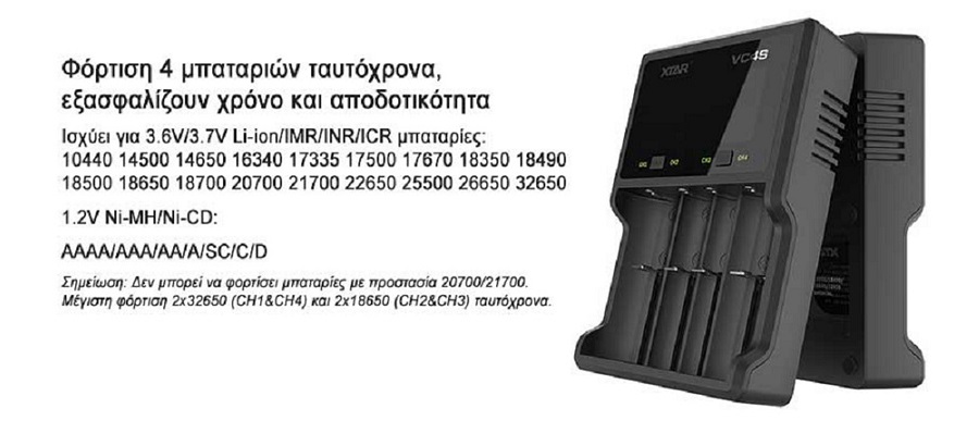 φορτιστής XTAR VC4S δεν μπορεί να φορτίσει μπαταρίες με προστασία 20700/21700.